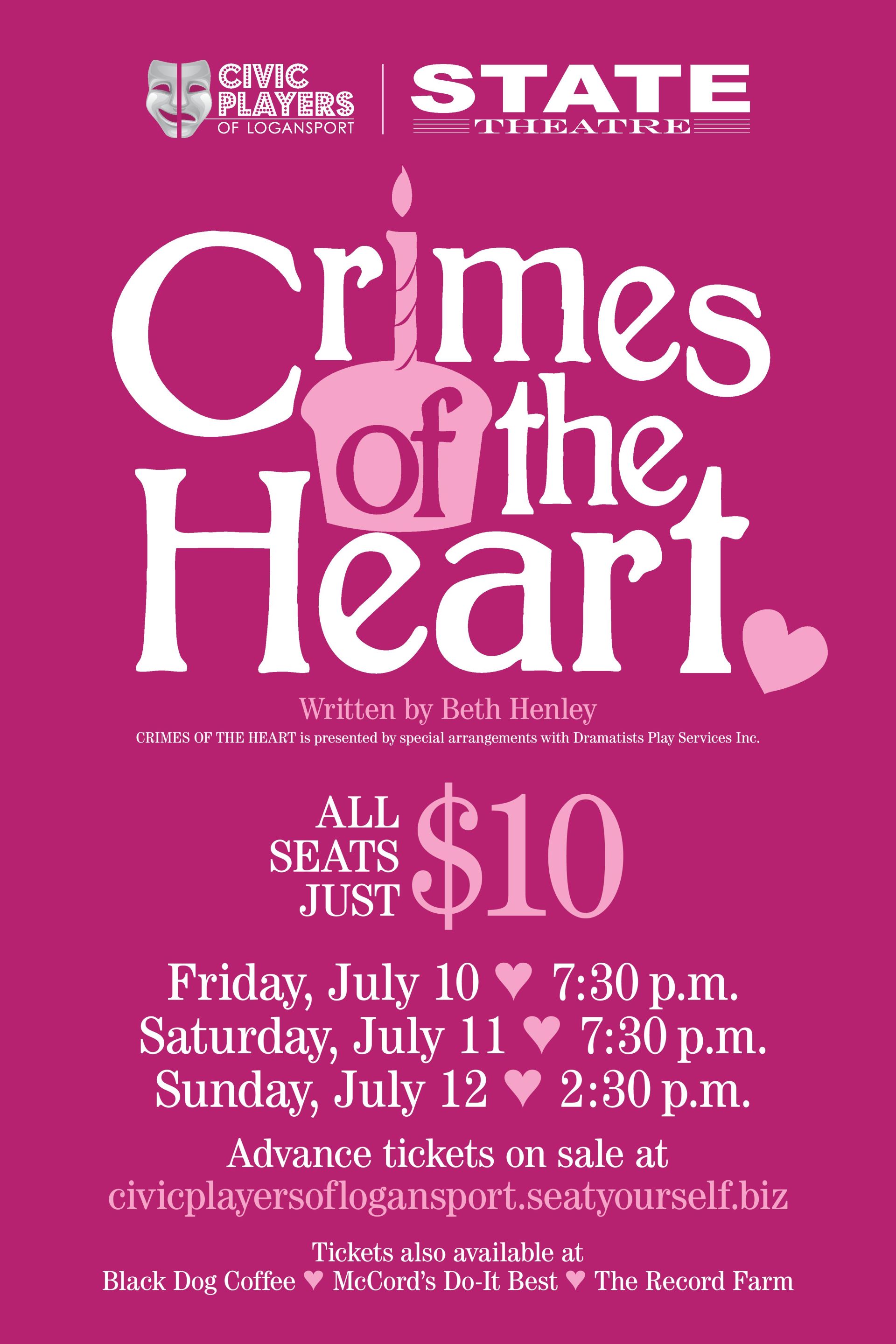 It's been a real bad day for the Magrath sisters. Lenny, the oldest sister, just turned 30 and has no man in sight; Meg, the middle sister, is back home in Hazlehurst, Mississippi after a failed singing carrier in Hollywood; and Babe, the youngest sister, is out on bail after shooting her husband. As the sisters, along with Babe's awkward and inexperienced lawyer and the sisters' prudish cousin Chick, try to figure out how to keep Babe out of prison, they must also deal with their grandfather's declining health while trying to keep all of their secrets hidden from one another. This hilarious yet moving show will have you laughing, screaming, and crying along with the crazy and deeply loving Magrath sisters. July 10 & 11 @ 7:30 p.m. July 12 @ 2:30 p.m. $10--All seating is general admission Popcorn & Concessions available Beer & Wine for patrons 21 & up Tickets available for purchase online now